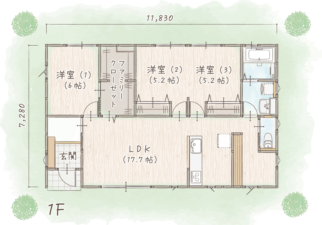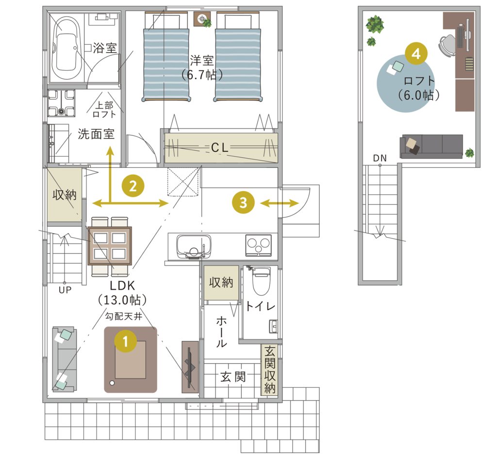 これらに機能的な収納や水回りを加えて、夫婦2人や子ども1人の家族が十分快適に暮らせる間取りを構成できます。